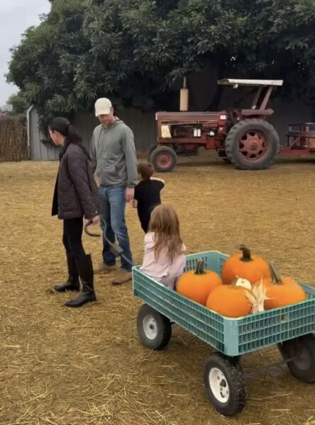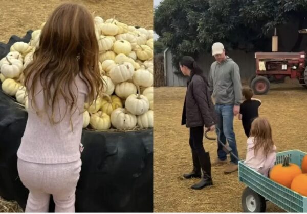 Four-year-old Lilibet is pulled in a wagon by Meghan, wearing a pastel outfit and riding among the pumpkins. Her bright red hair and cheerful smile added to the wholesome scene.